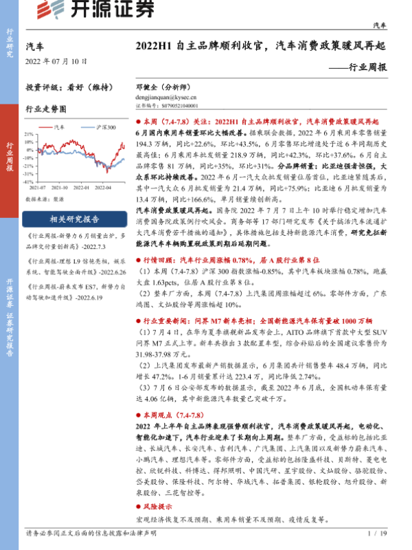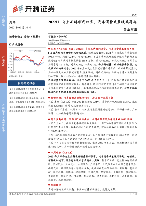 【开源证券】【20220710】2022H1自主品牌顺利收官,汽车消费政策暖风再起-19页