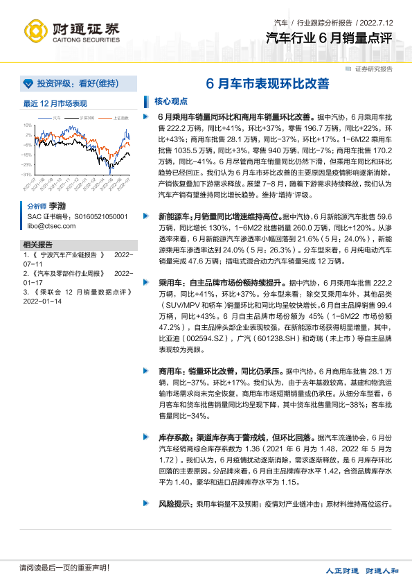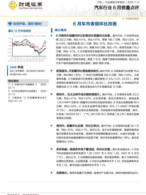【财通证券】【20220712】汽车行业6月销量点评:6月车市表现环比改善-2页