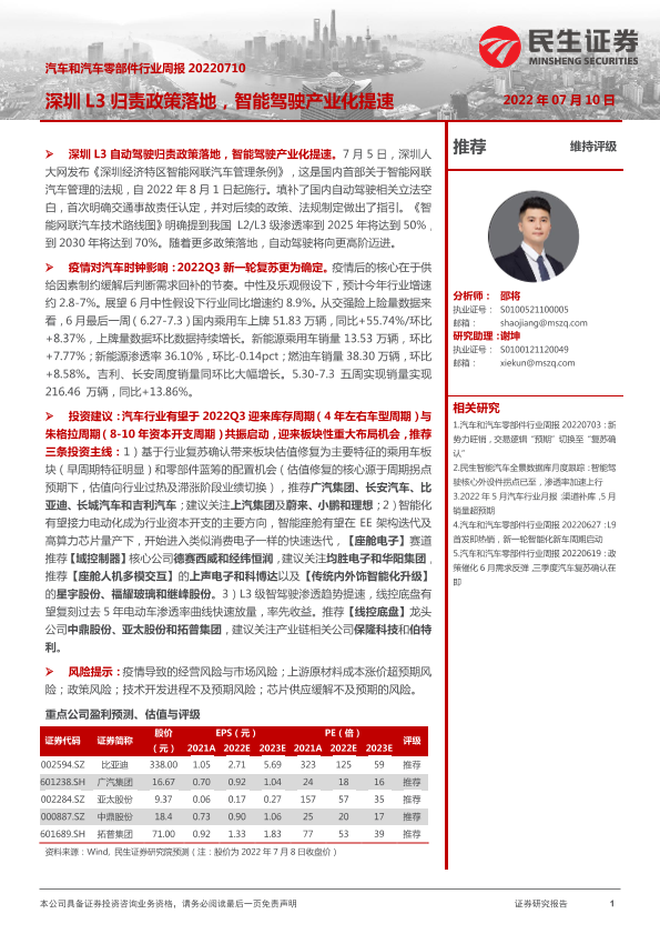 【民生证券】【20220710】汽车和汽车零部件行业周报:深圳L3归责政策落地,智能驾驶产业化提速-33页