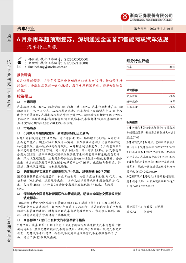 【浙商证券】【20220710】20220710-浙商证券-汽车行业周报:6月乘用车超预期复苏,深圳通过全国首部智能网联汽车法规-32页