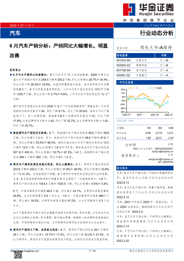 【华金证券】【20220713】20220713-华金证券-汽车行业动态分析:6月汽车产销分析:产销同比大幅增长,明显改善-14页