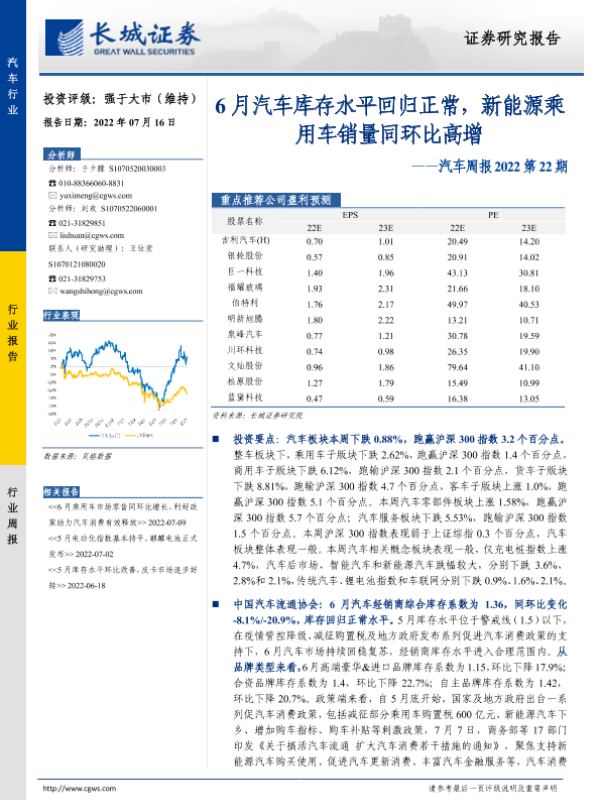 【长城证券】【20220716】汽车周报2022第22期:6月汽车库存水平回归正常,新能源乘用车销量同环比高增-16页