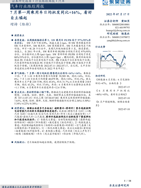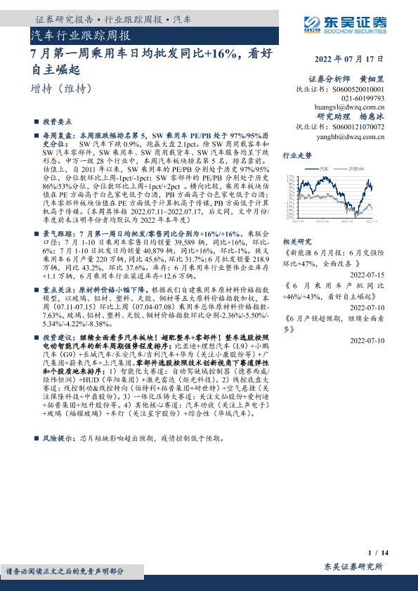 【东吴证券】【20220717】20220717-东吴证券-汽车行业跟踪周报:7月第一周乘用车日均批发同比+16%,看好自主崛起-14页