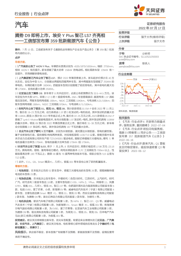 【天风证券】【20220717】汽车:工信部发布第359批新能源汽车《公告》-腾势D9即将上市,埃安YPlus智己LS7齐亮相-8页