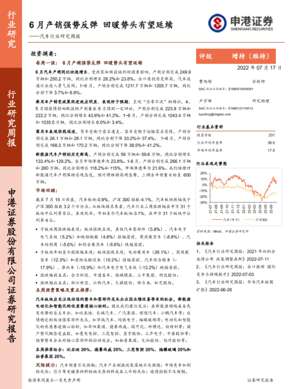 【申港证券】【20220717】6月产销强势反弹 回暖势头有望延续——汽车行业研究周报-16页