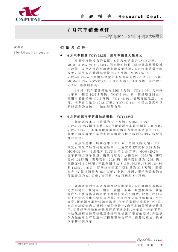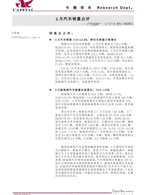 【群益证券】【20220720】6月汽车销量点评:政策刺激下,6月汽车销量大幅增长-3页