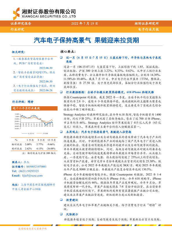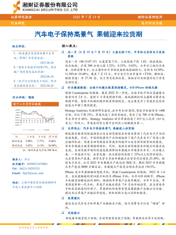【湘财证券】【20220719】20220719-湘财证券-电子行业月报:汽车电子保持高景气 果链迎来拉货期-10页