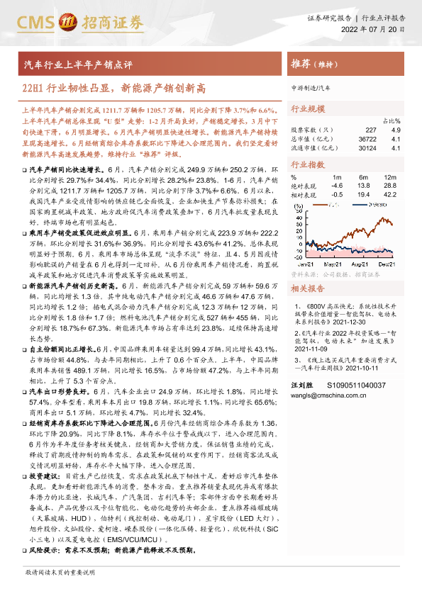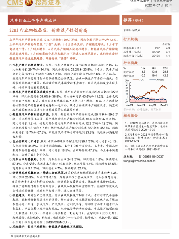 【海通证券】【20220720】汽车行业上半年产销点评:22H1行业韧性凸显,新能源产销创新高-4页