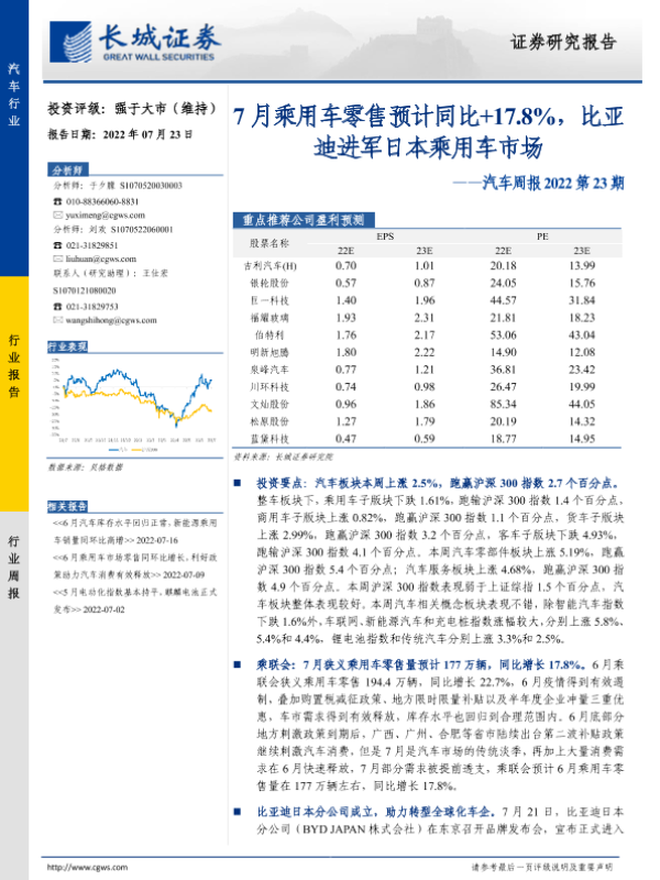 【长城证券】【20220723】汽车周报2022第23期:7月乘用车零售预计同比+17.8%,比亚迪进军日本乘用车市场-13页
