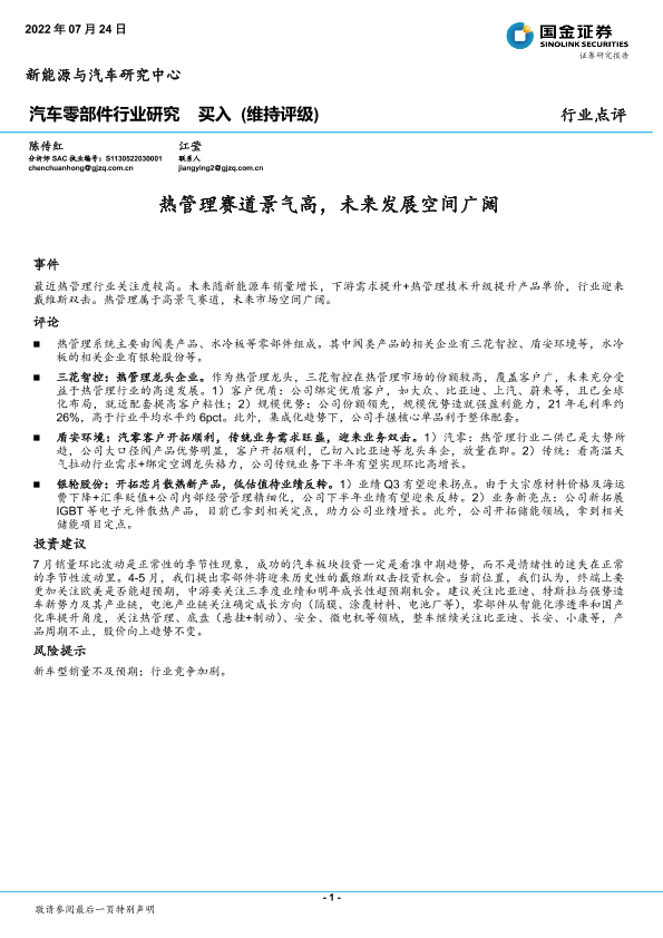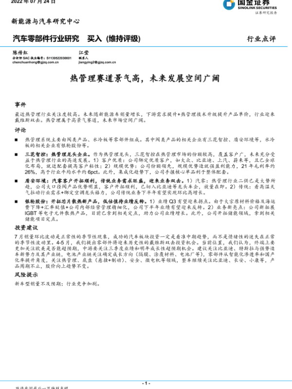 【国金证券】【20220724】汽车零部件行业研究:热管理赛道景气高,未来发展空间广阔-3页