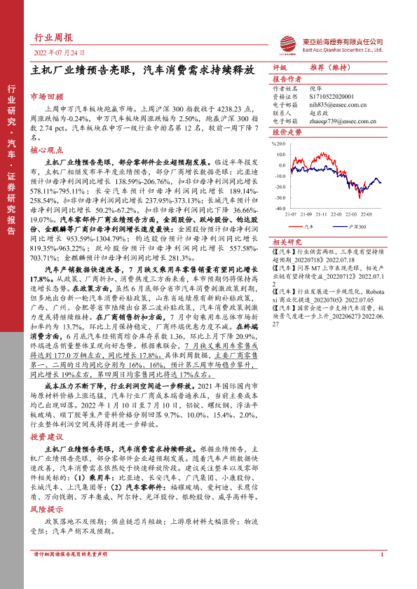 【东亚前海证券】【20220724】20220724-东亚前海证券-汽车行业周报:主机厂业绩预告亮眼,汽车消费需求持续释放-26页