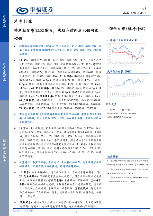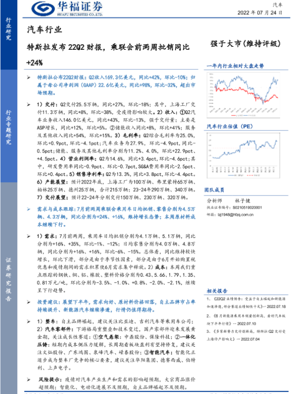 【华福证券】【20220724】特斯拉发布22Q2财报,乘联会前两周批销同比+24%-9页