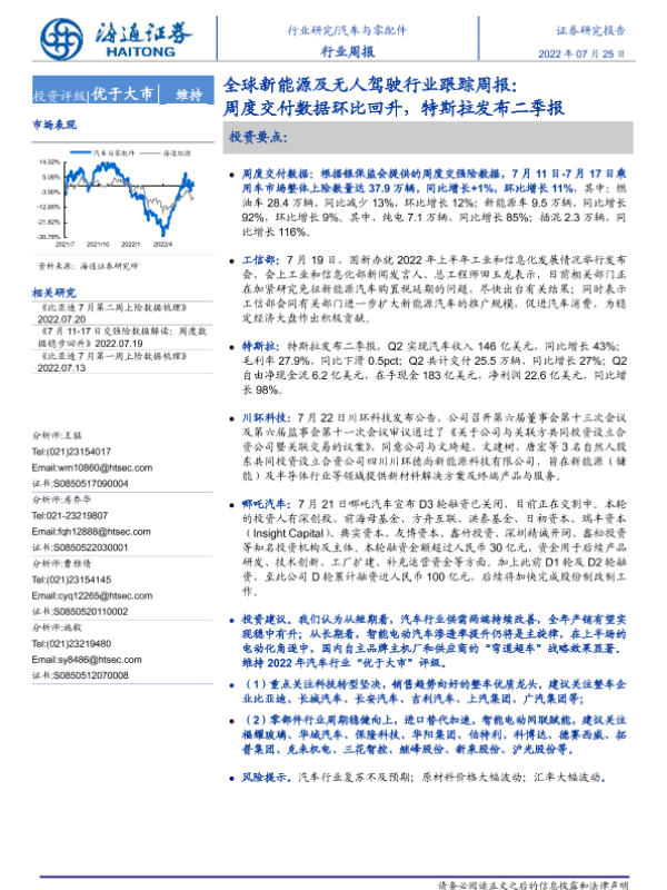 【海通证券】【20220725】全球新能源及无人驾驶行业跟踪周报:周度交付数据环比回升,特斯拉发布二季报-2页