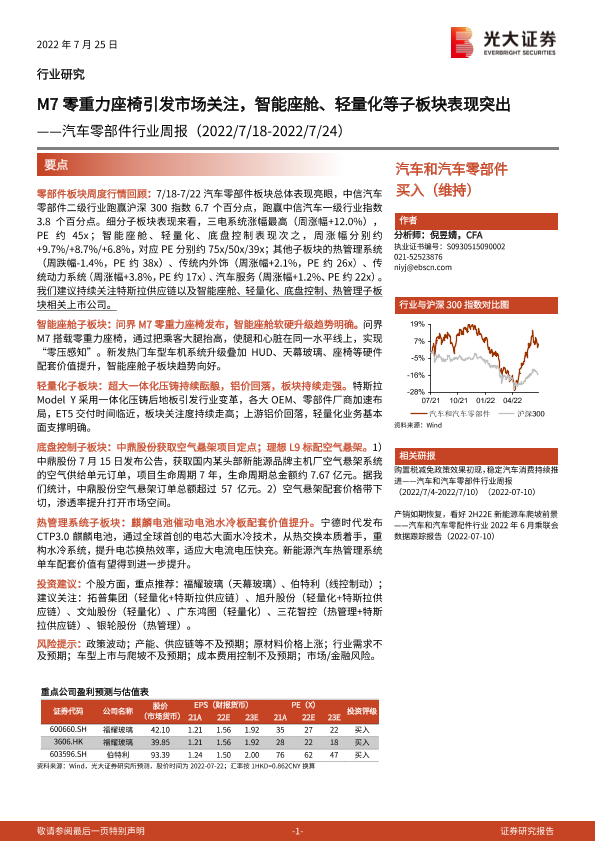 【光大证券】【20220725】汽车零部件行业周报:M7零重力座椅引发市场关注,智能座舱、轻量化等子板块表现突出-18页