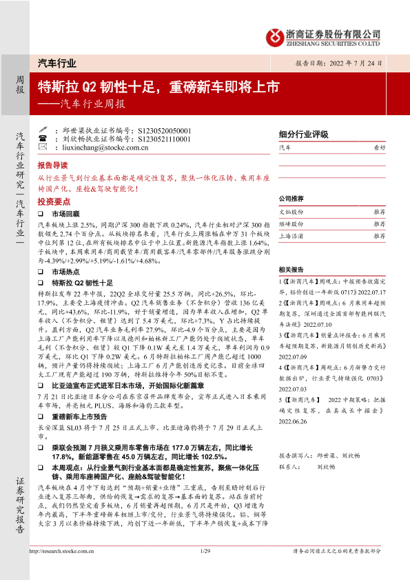 【浙商证券】【20220724】20220724-浙商证券-汽车行业周报:特斯拉Q2韧性十足,重磅新车即将上市-29页