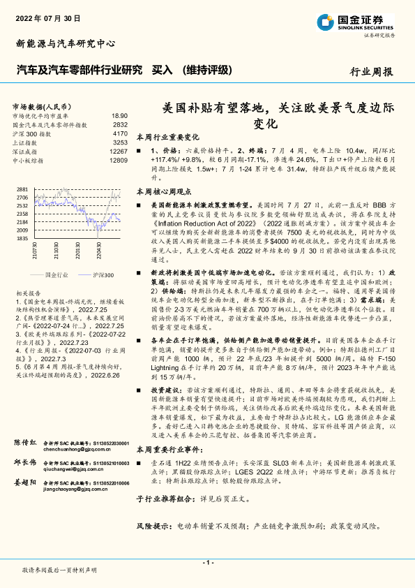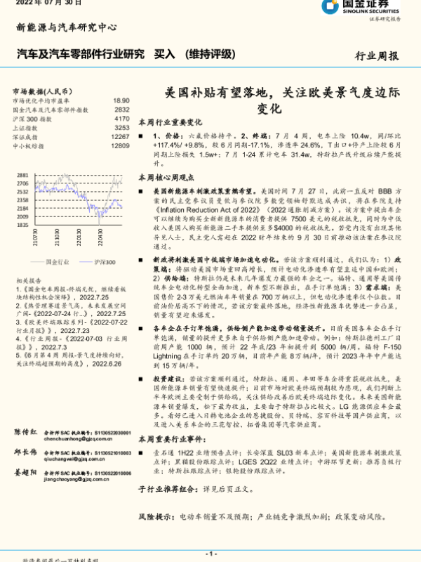 【国金证券】【20220730】汽车及汽车零部件行业研究周报:美国补贴有望落地,关注欧美景气度边际变化-12页