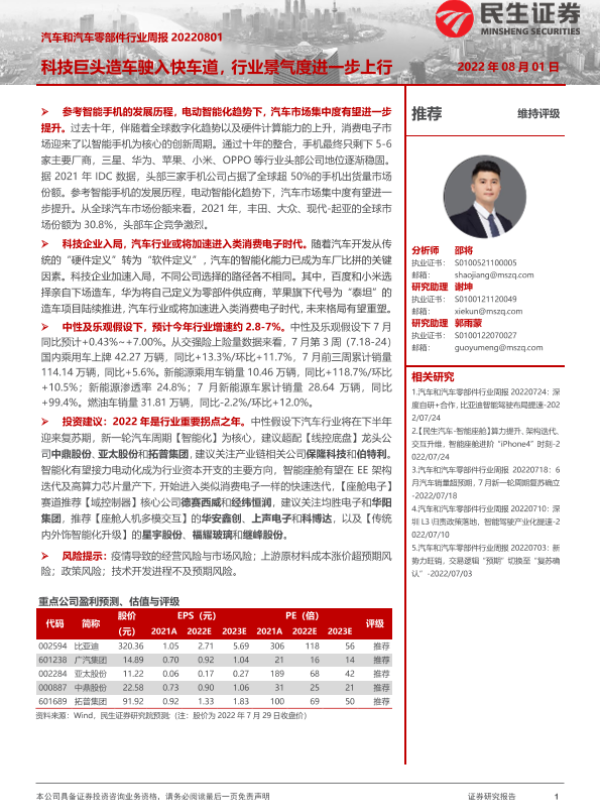 【民生证券】【20220801】汽车和汽车零部件行业周报:科技巨头造车驶入快车道,行业景气度进一步上行-28页