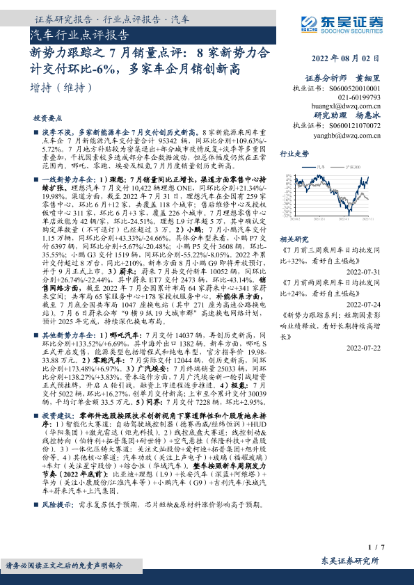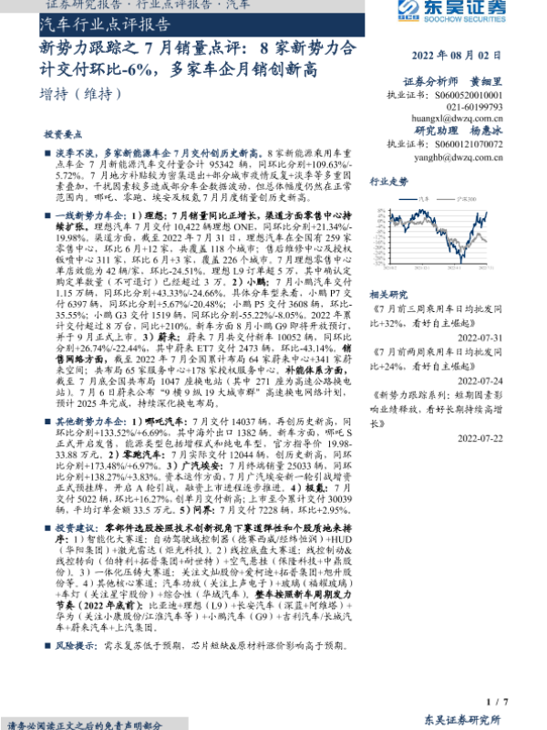【东吴证券】【20220802】20220802-东吴证券-汽车行业点评报告:新势力跟踪之7月销量点评:8家新势力合计交付环比-6%,多家车企月销创新高-7页