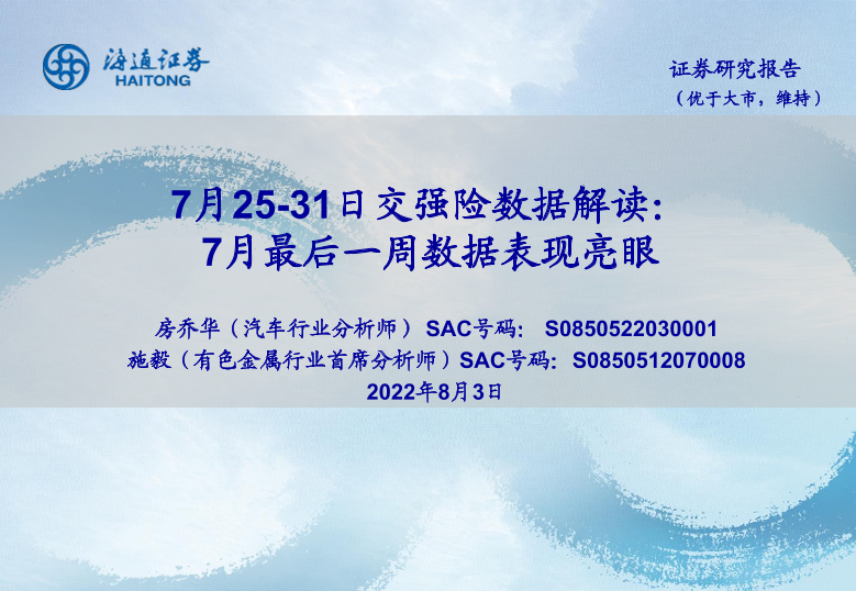 【海通证券】【20220803】7月25-31日交强险数据解读:7月最后一周数据表现亮眼-5页