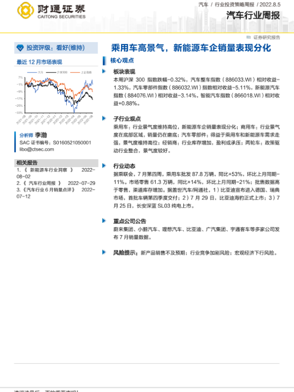 【财通证券】【20220805】20220805-财通证券-汽车行业周报:乘用车高景气,新能源车企销量表现分化-12页