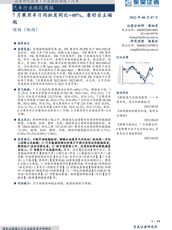 【东吴证券】【20220807】20220807-东吴证券-汽车行业跟踪周报:7月乘用车日均批发同比+40%,看好自主崛起-14页