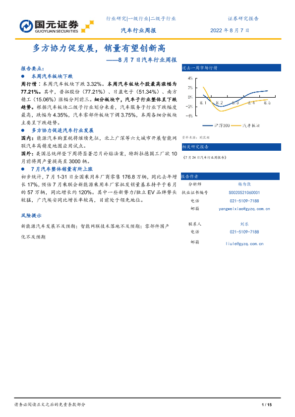 【国元证券】【20220807】20220807-国元证券-汽车行业周报:多方协力促发展,销量有望创新高-15页