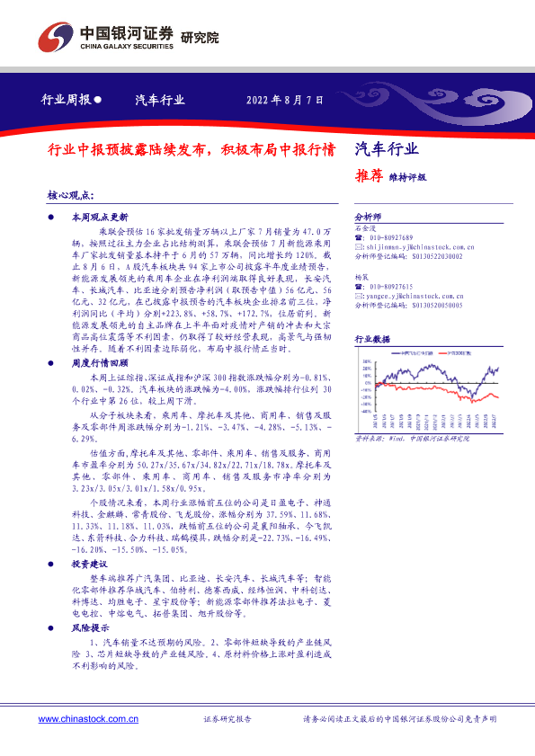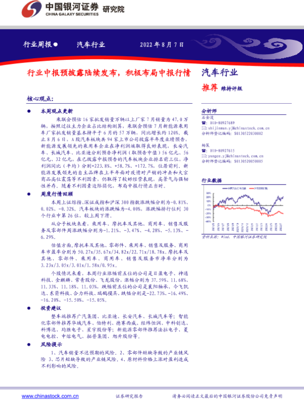 【银河证券】【20220807】20220807-中国银河-汽车行业周报:行业中报预披露陆续发布,积极布局中报行情-15页