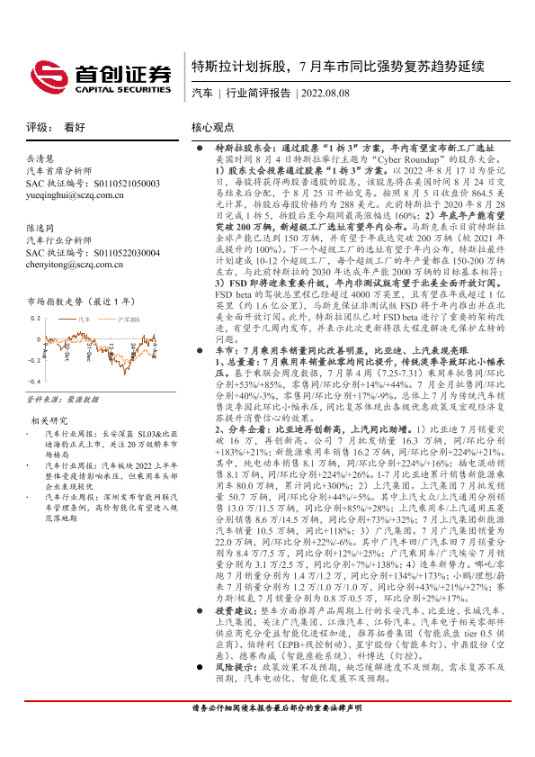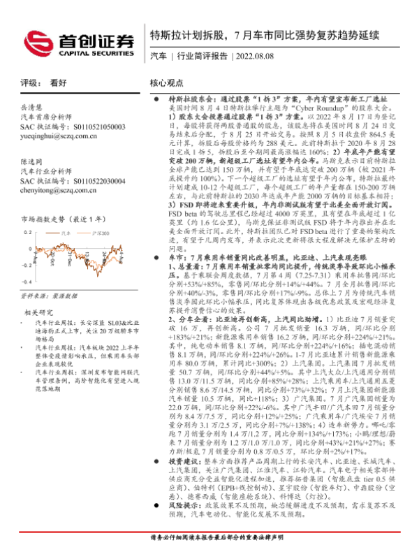【首创证券】【20220808】20220808-首创证券-汽车行业简评报告:特斯拉计划拆股,7月车市同比强势复苏趋势延续-11页