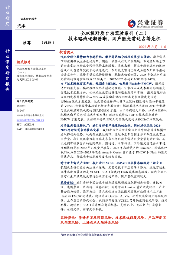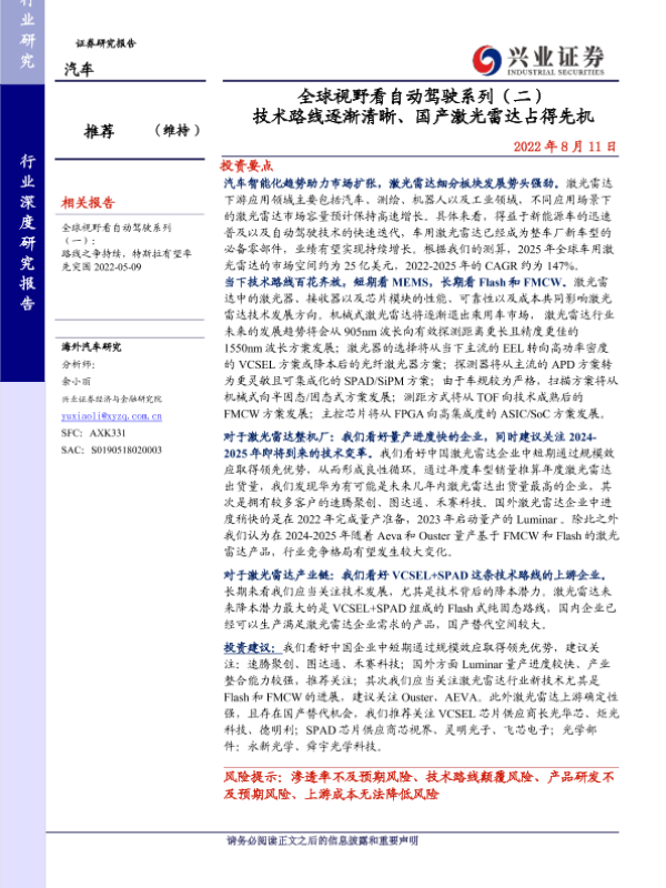 【兴业证券】【20220811】全球视野看自动驾驶系列(二) 技术路线逐渐清晰、国产激光雷达占得先机-77页