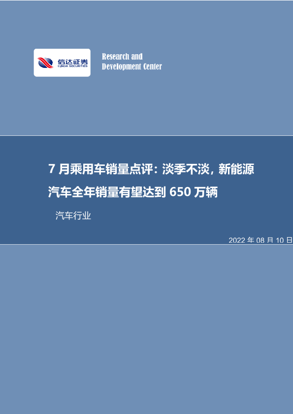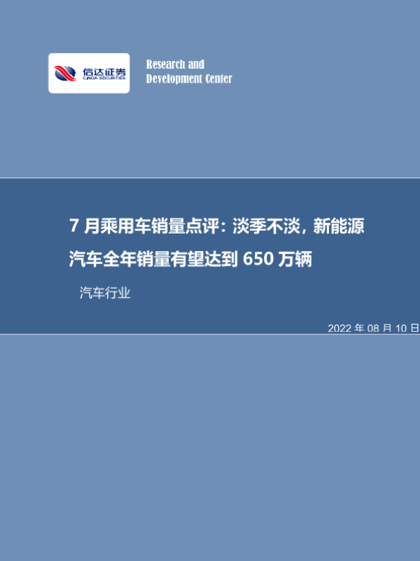 【信达证券】【20220810】7月乘用车销量点评:淡季不淡,新能源汽车全年销量有望达到650万辆-12页