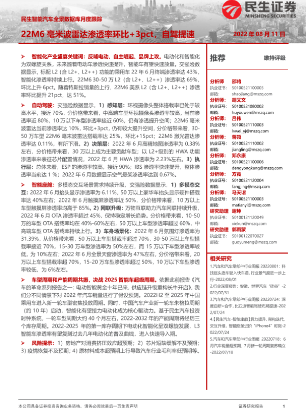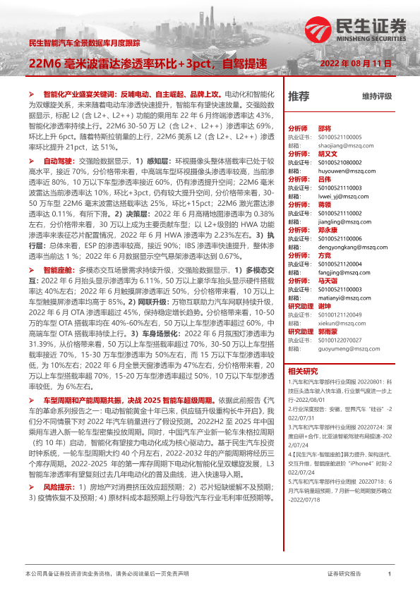 【民生证券】【20220811】民生智能汽车全景数据库月度跟踪:22M6毫米波雷达渗透率环比+3pct,自驾提速-17页