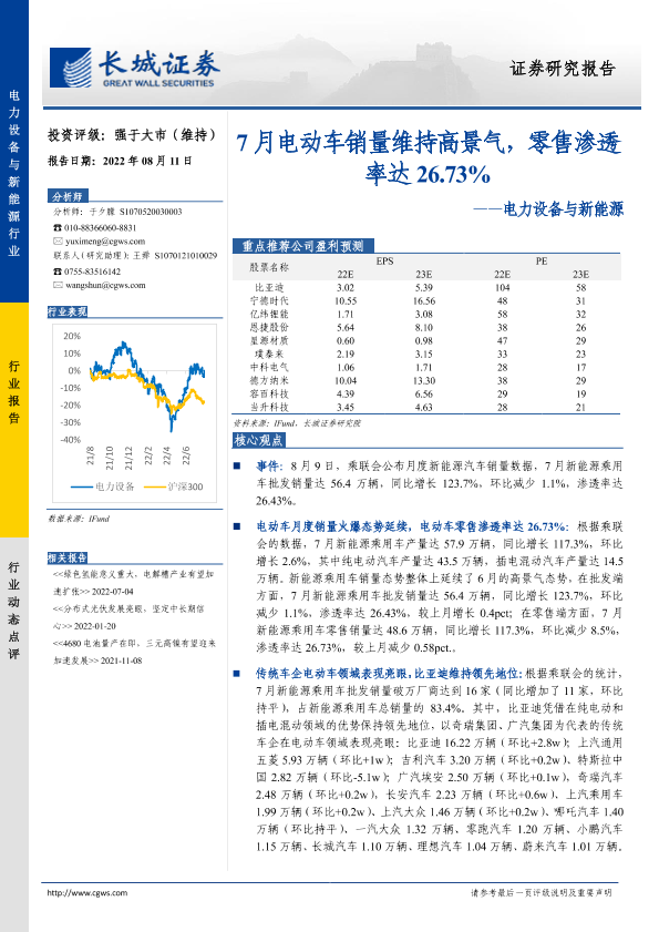【长城证券】【20220811】20220811-长城证券-电力设备与新能源:7月电动车销量维持高景气,零售渗透率达26.73%-3页
