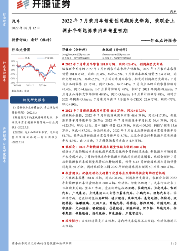 【开源证券】【20220812】2022年7月乘用车销量创同期历史新高,乘联会上调全年新能源乘用车销量预期-3页