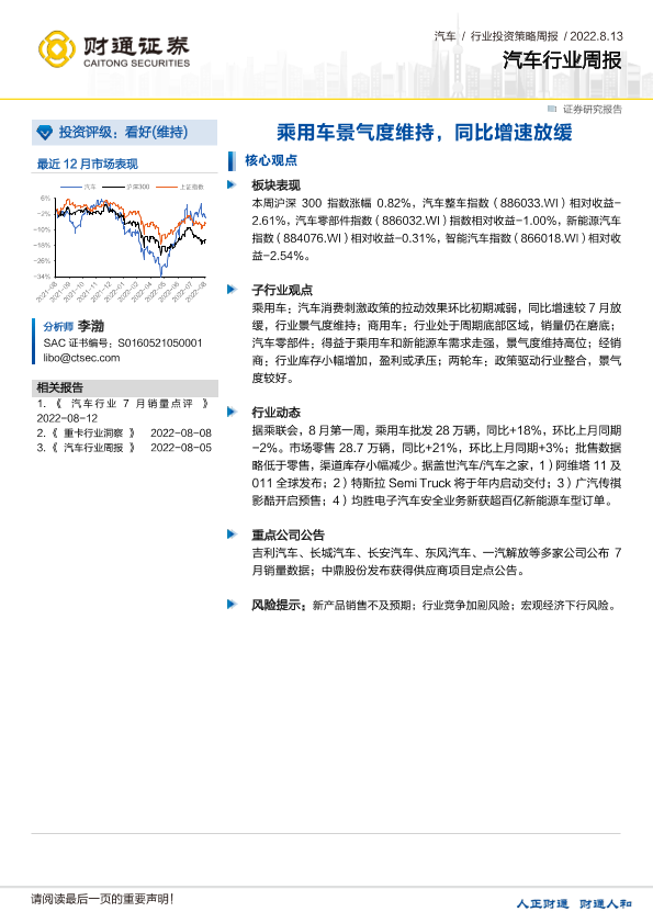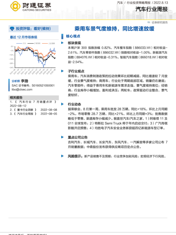 【财通证券】【20220813】20220813-财通证券-汽车行业周报:乘用车景气度维持,同比增速放缓-14页