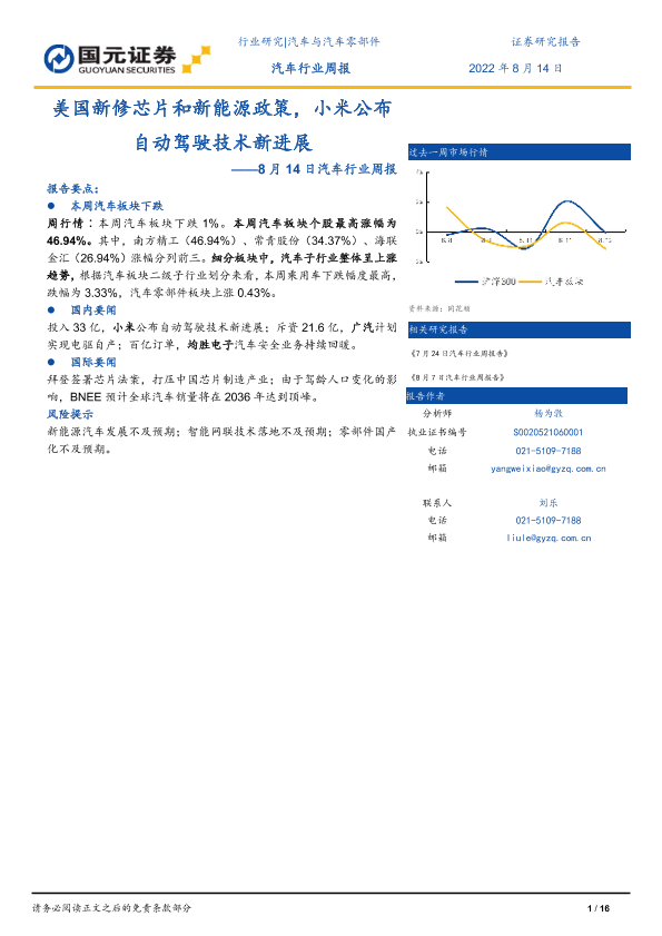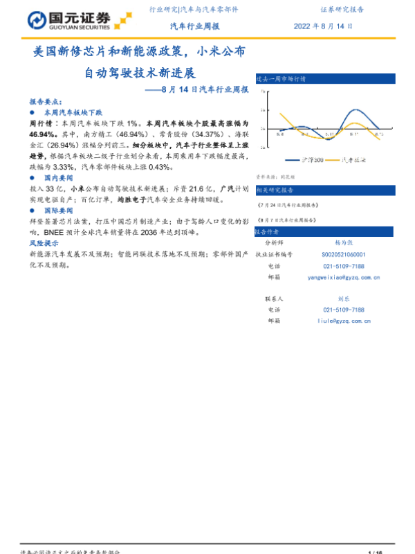 【国元证券】【20220814】20220814-国元证券-汽车行业周报:美国新修芯片和新能源政策,小米公布自动驾驶技术新进展-16页