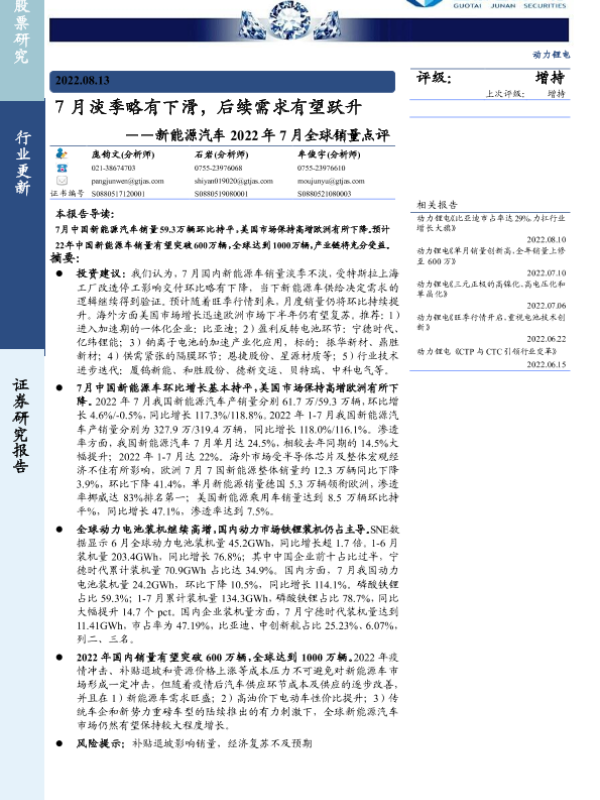 【国泰君安证券】【20220813】新能源汽车2022年7月全球销量点评:7月淡季略有下滑,后续需求有望跃升-12页