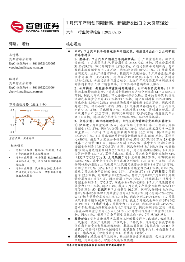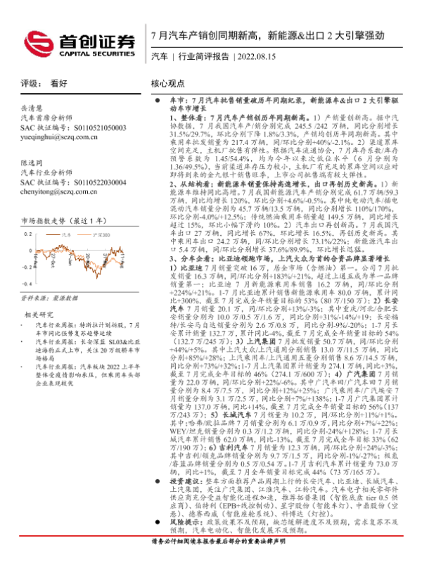 【首创证券】【20220815】20220815-首创证券-汽车行业简评报告:7月汽车产销创同期新高,新能源&出口2大引擎强劲-12页