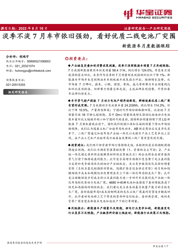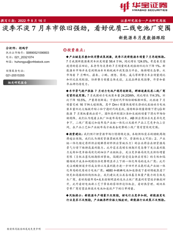 【华宝证券】【20220816】20220816-华宝证券-新能源车月度数据跟踪:淡季不淡7月车市依旧强劲,看好优质二线电池厂突围-7页