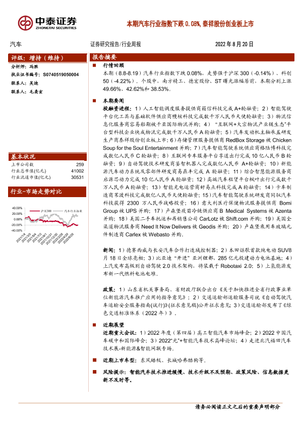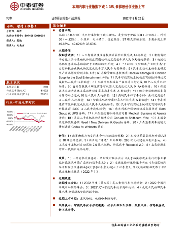【中泰证券】【20220820】20220820-中泰证券-汽车行业周报:本期汽车行业指数下跌0.08%,泰祥股份创业板上市-10页