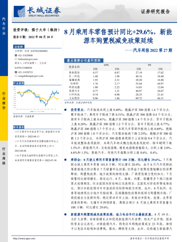 【长城证券】【20220820】汽车周报2022第27期:8月乘用车零售预计同比+29.6%,新能源车购置税减免政策延续-13页