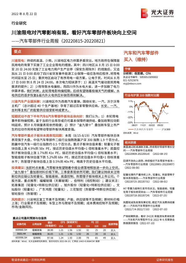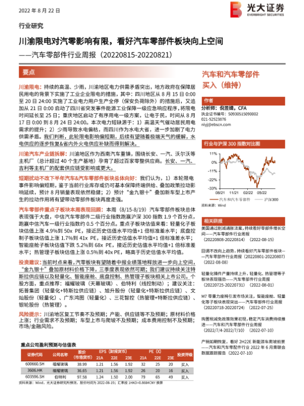 【光大证券】【20220822】汽车零部件行业周报:川渝限电对汽零影响有限,看好汽车零部件板块向上空间-21页