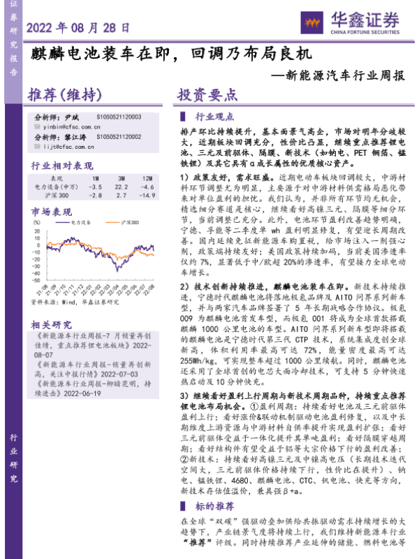【华鑫证券】【20220828】20220828-华鑫证券-新能源汽车行业周报:麒麟电池装车在即,回调乃布局良机-17页