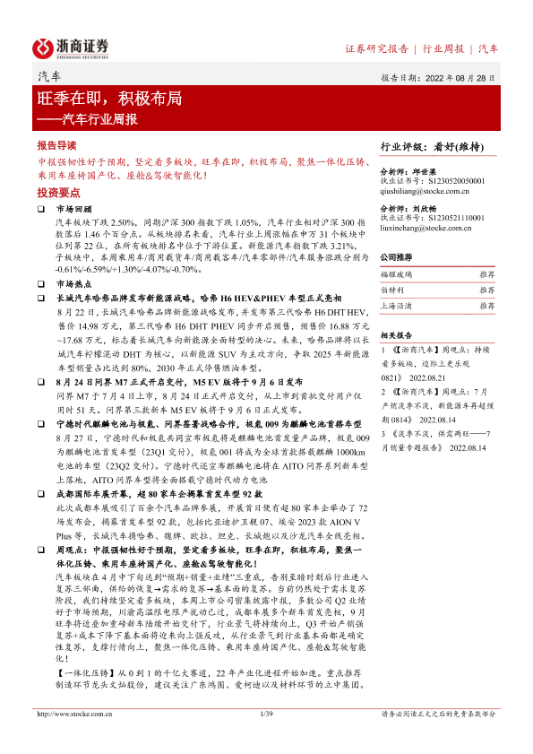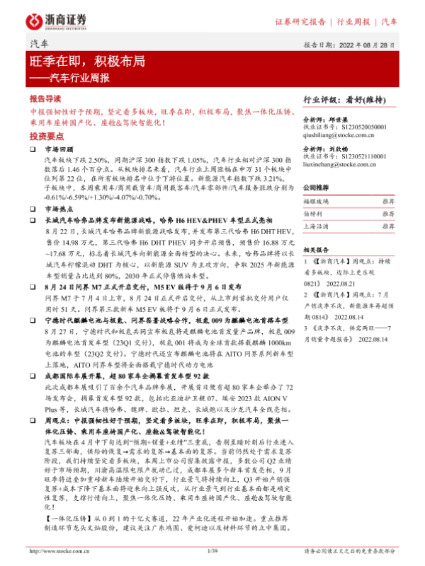 【浙商证券】【20220828】20220828-浙商证券-汽车行业周报:旺季在即,积极布局-39页