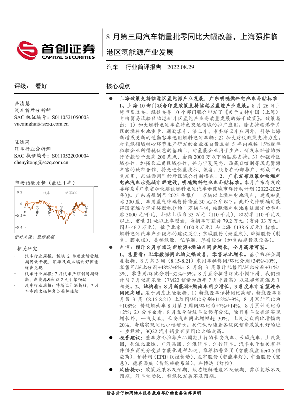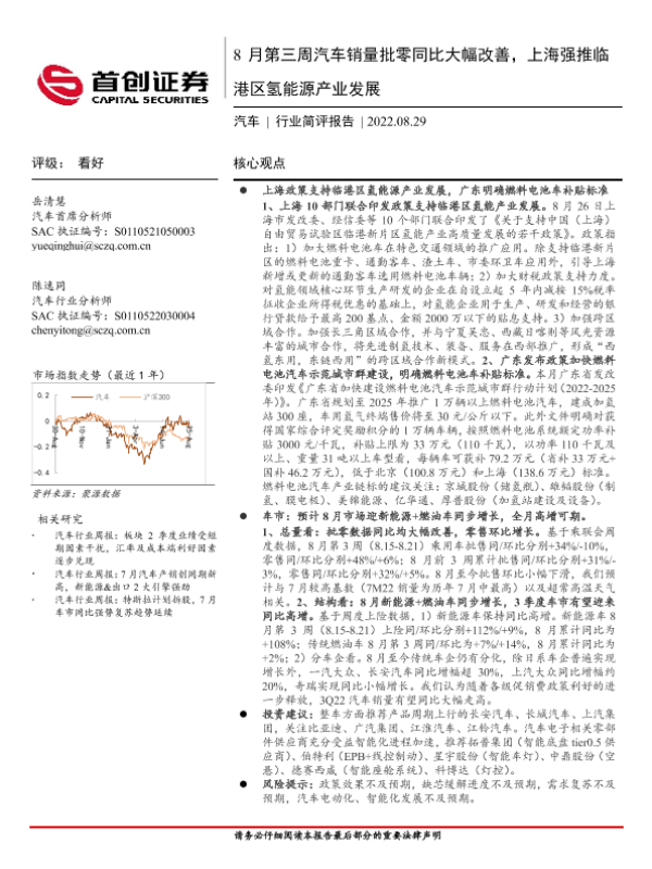 【首创证券】【20220829】20220829-首创证券-汽车行业简评报告:8月第三周汽车销量批零同比大幅改善,上海强推临港区氢能源产业发展-11页