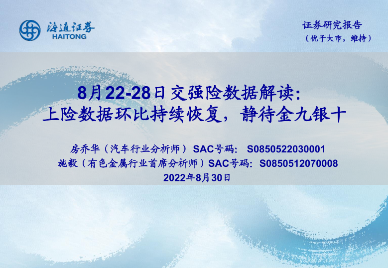 【海通证券】【20220830】8月22-28日交强险数据解读:上险数据环比持续恢复,静待金九银十-5页