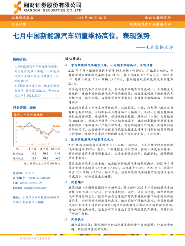 【湘财证券】【20220826】新能源汽车行业七月数据点评:七月中国新能源汽车销量维持高位,表现强势-15页