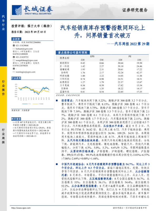 【长城证券】【20220903】汽车周报2022第29期:汽车经销商库存预警指数同环比上升,问界销量首次破万-17页