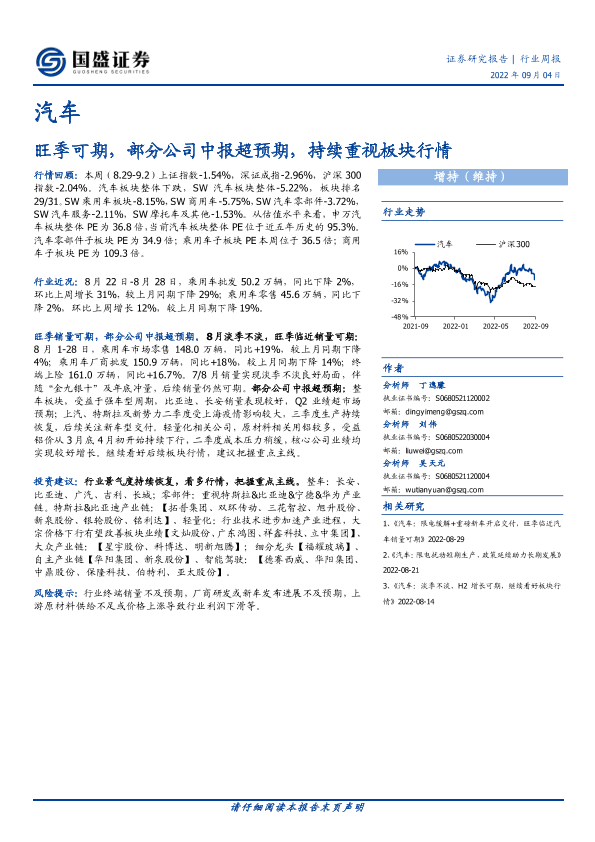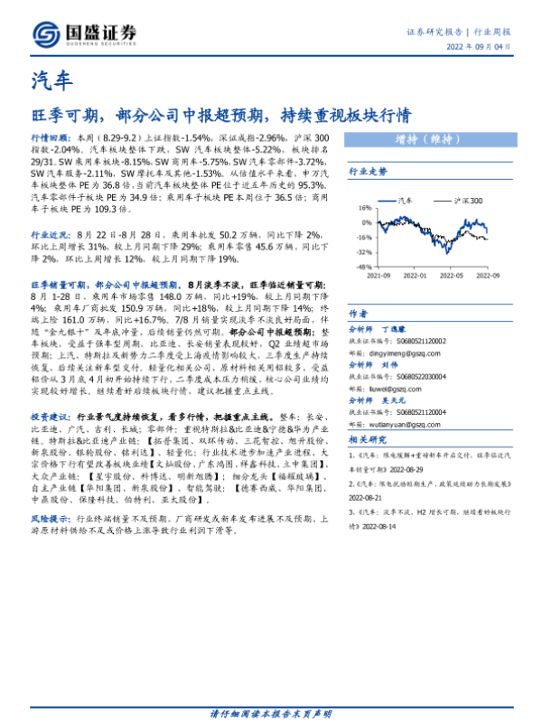 【国盛证券】【20220904】20220904-国盛证券-汽车行业周报:旺季可期,部分公司中报超预期,持续重视板块行情-23页