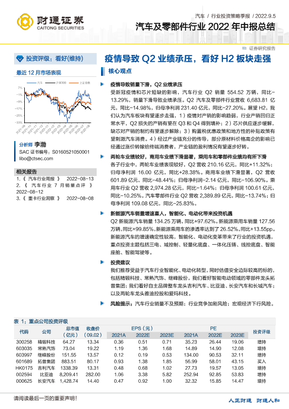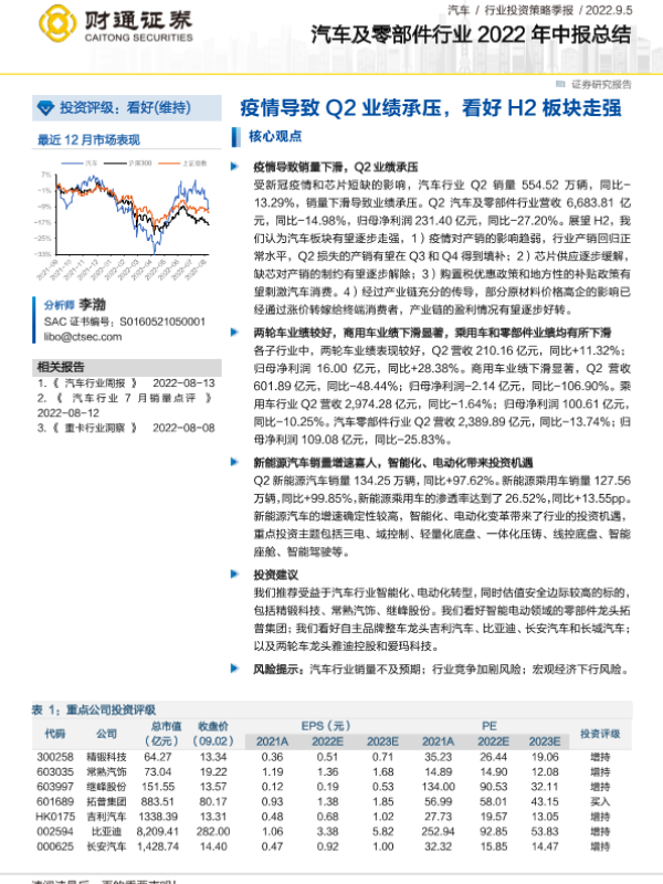 【财通证券】【20220905】汽车及零部件行业2022年中报总结:疫情导致Q2业绩承压,看好H2板块走强-15页