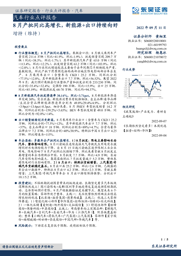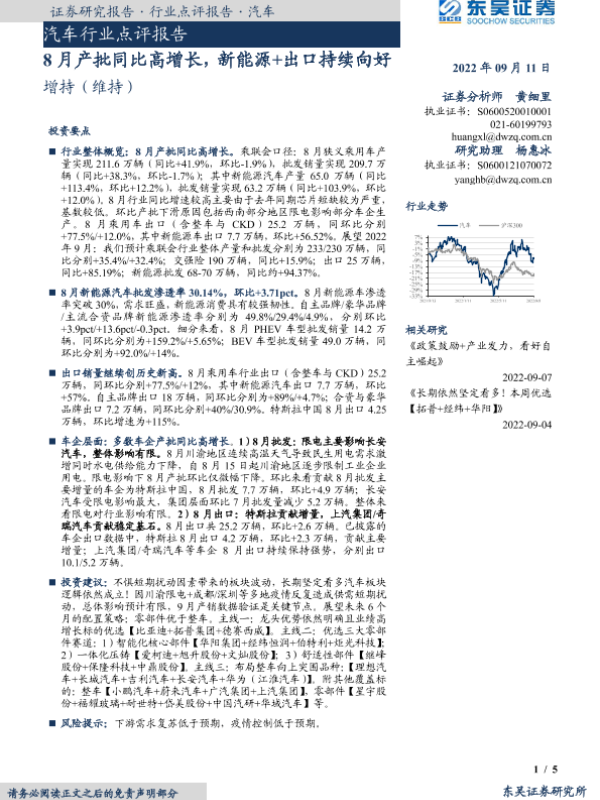 【东吴证券】【20220911】20220911-东吴证券-汽车行业点评报告:8月产批同比高增长,新能源+出口持续向好-5页